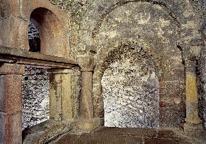 vorbei an Sandsteinsäulen mit reich ornamentierten Kapitellen,